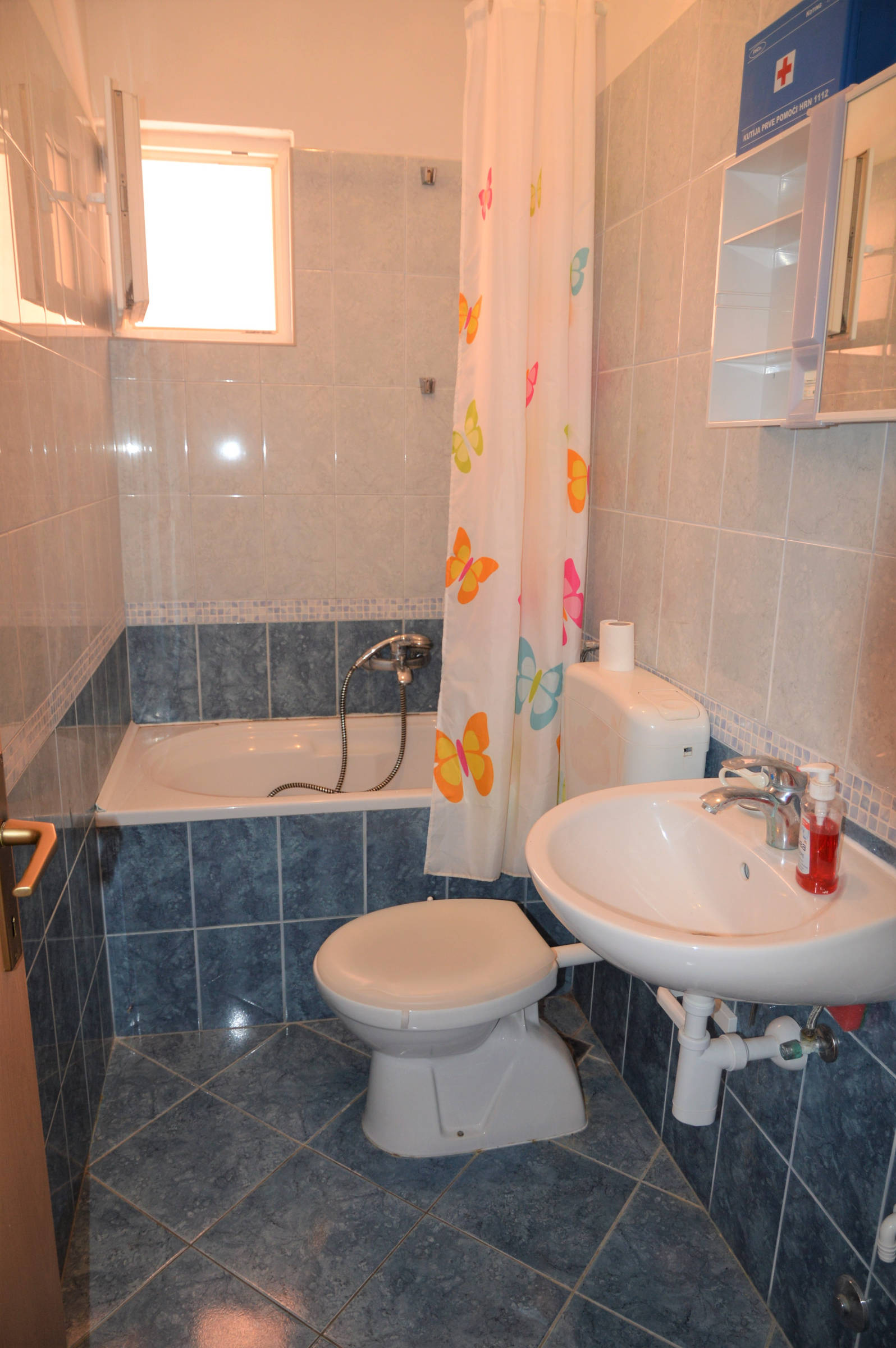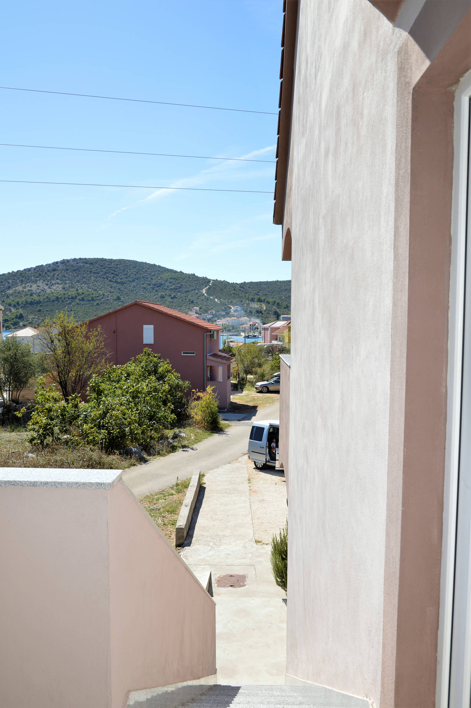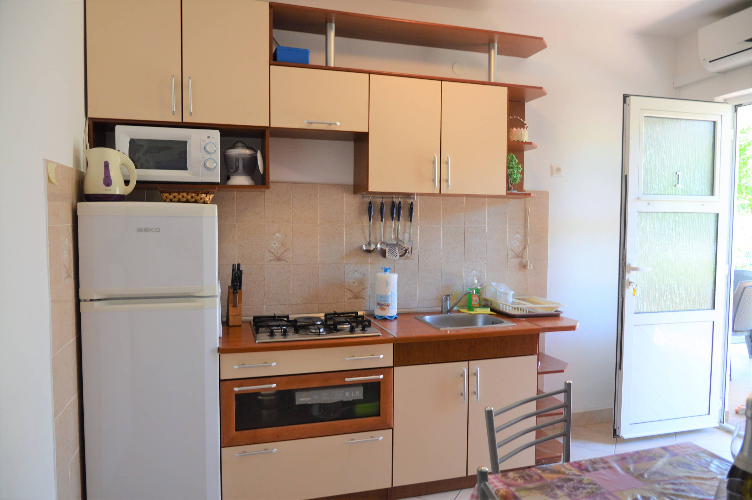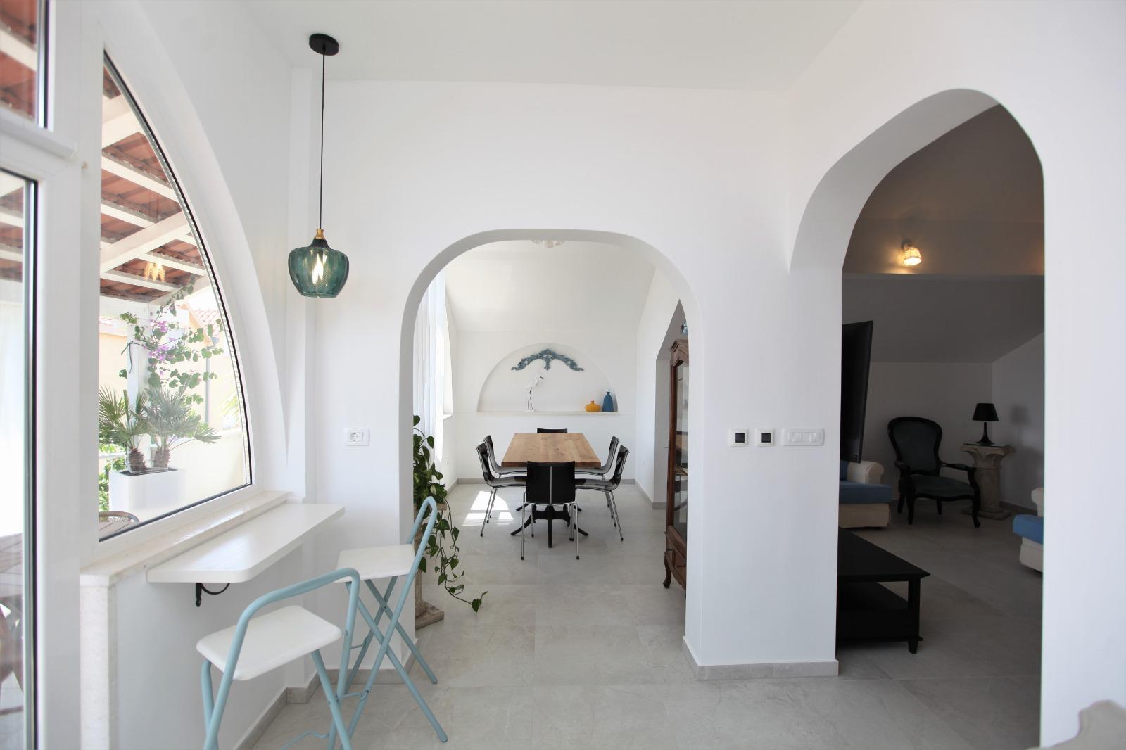 It’s situated on the first floor of family house . It consists of : 4 bedrooms, 3 of them have balconies with seating area and sea view, kitchen with balcony with sea view, living room with balcony with sea view, bathroom with toilet and bathtub and one separate toilet. The entrance in the house is shared with indoor steps to the apartment. The apartment is fully equipped with 4 air conditioning units, wi-fi, tv, and other things you might need. The owners live on the ground floor and are there if you need them at any time.