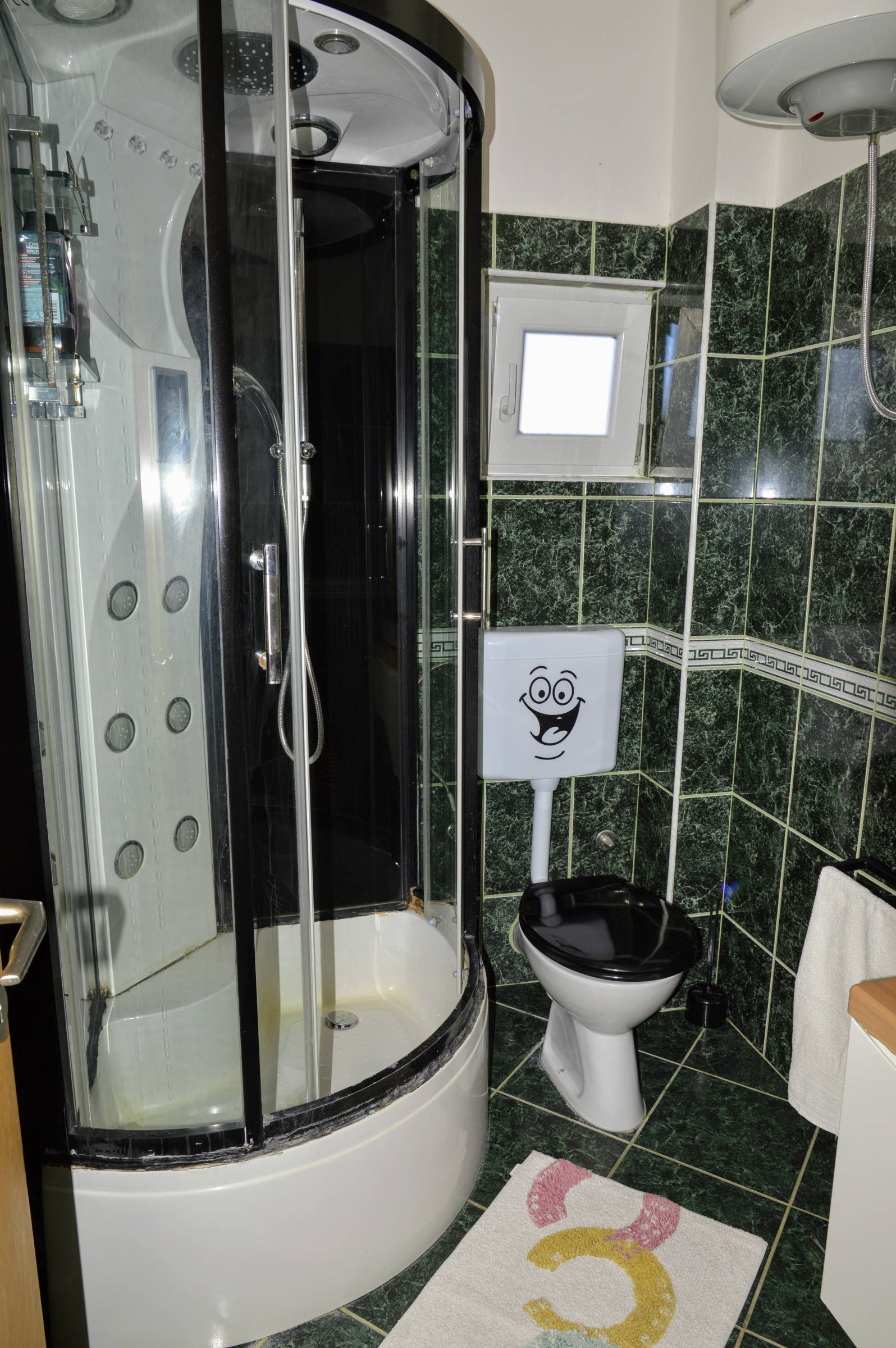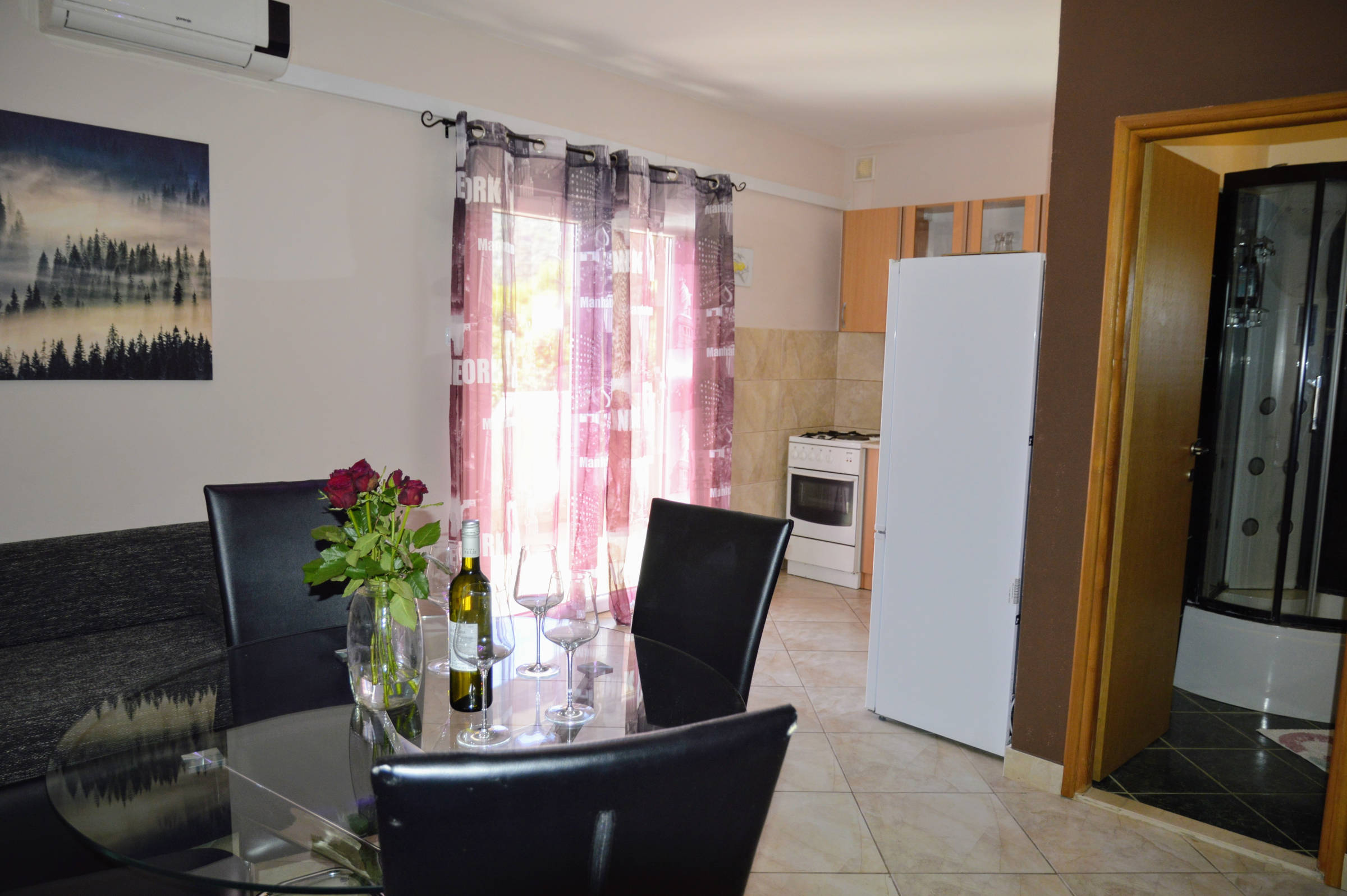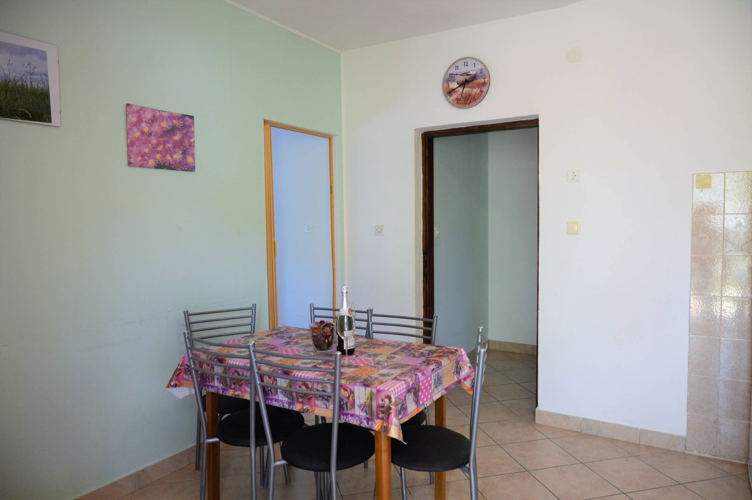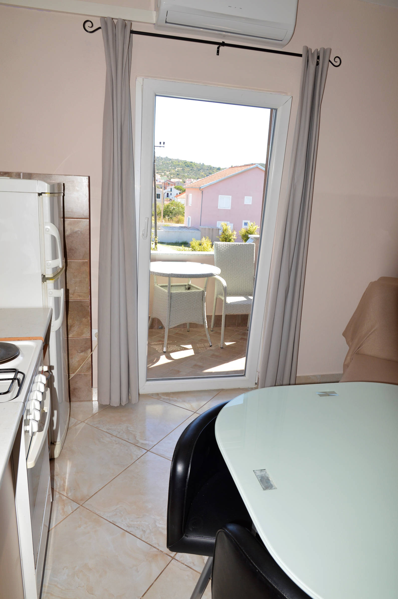 It’s situated on the first floor of family house . It consists of : 4 bedrooms, 3 of them have balconies with seating area and sea view, kitchen with balcony with sea view, living room with balcony with sea view, bathroom with toilet and bathtub and one separate toilet. The entrance in the house is shared with indoor steps to the apartment. The apartment is fully equipped with 4 air conditioning units, wi-fi, tv, and other things you might need. The owners live on the ground floor and are there if you need them at any time.