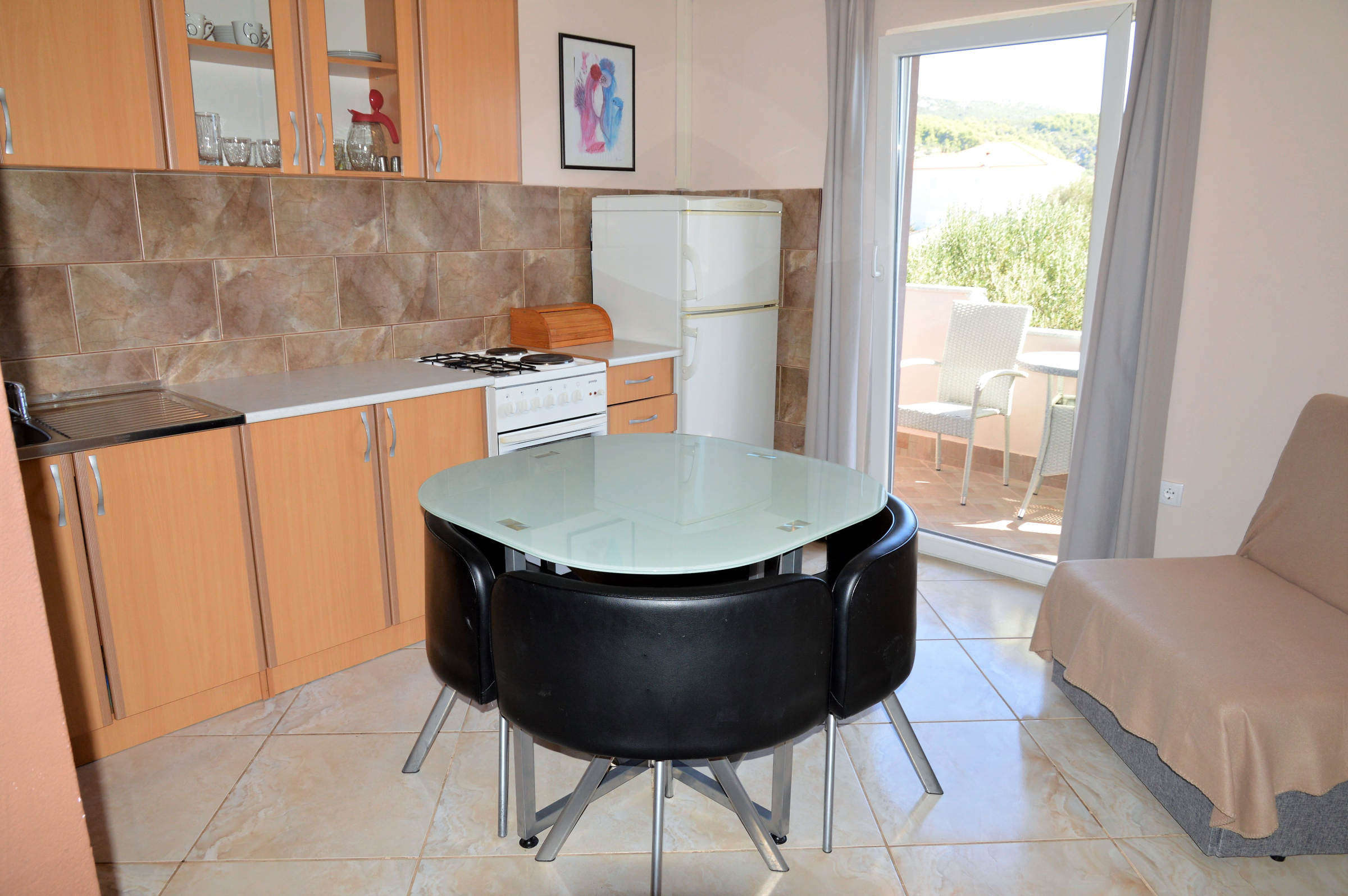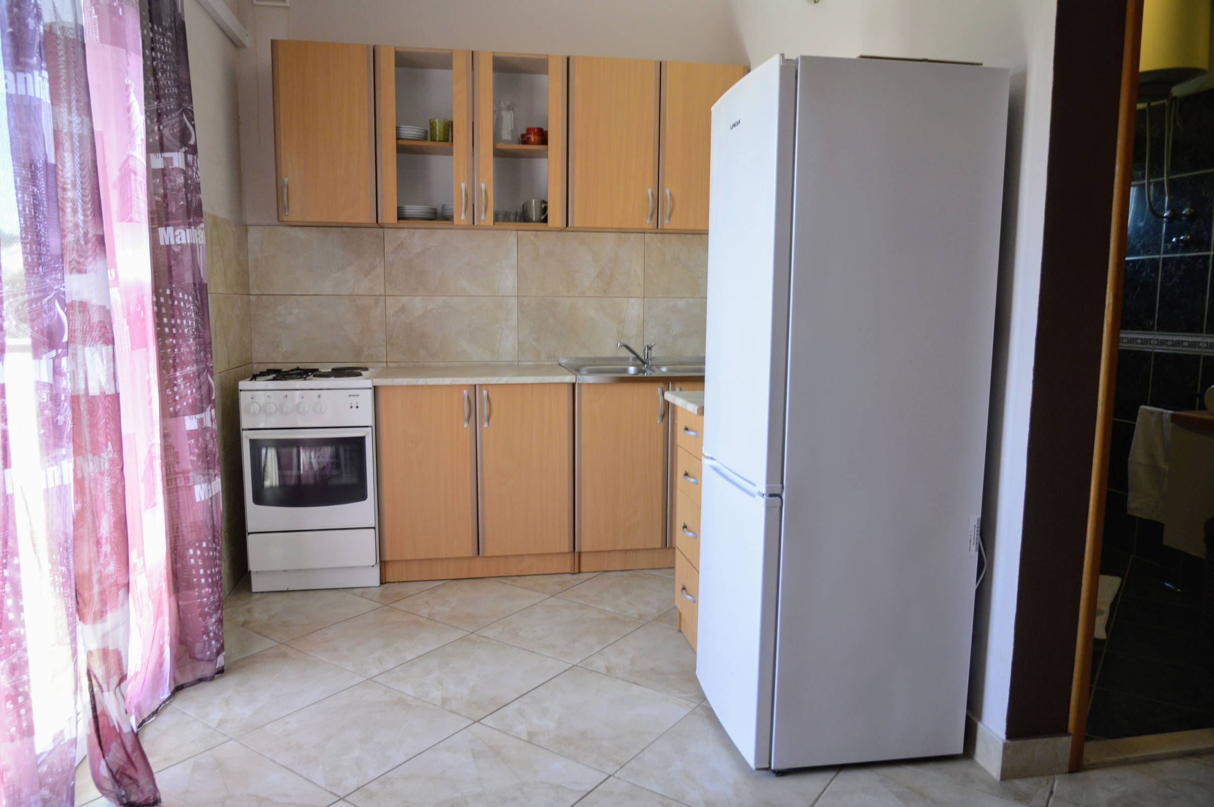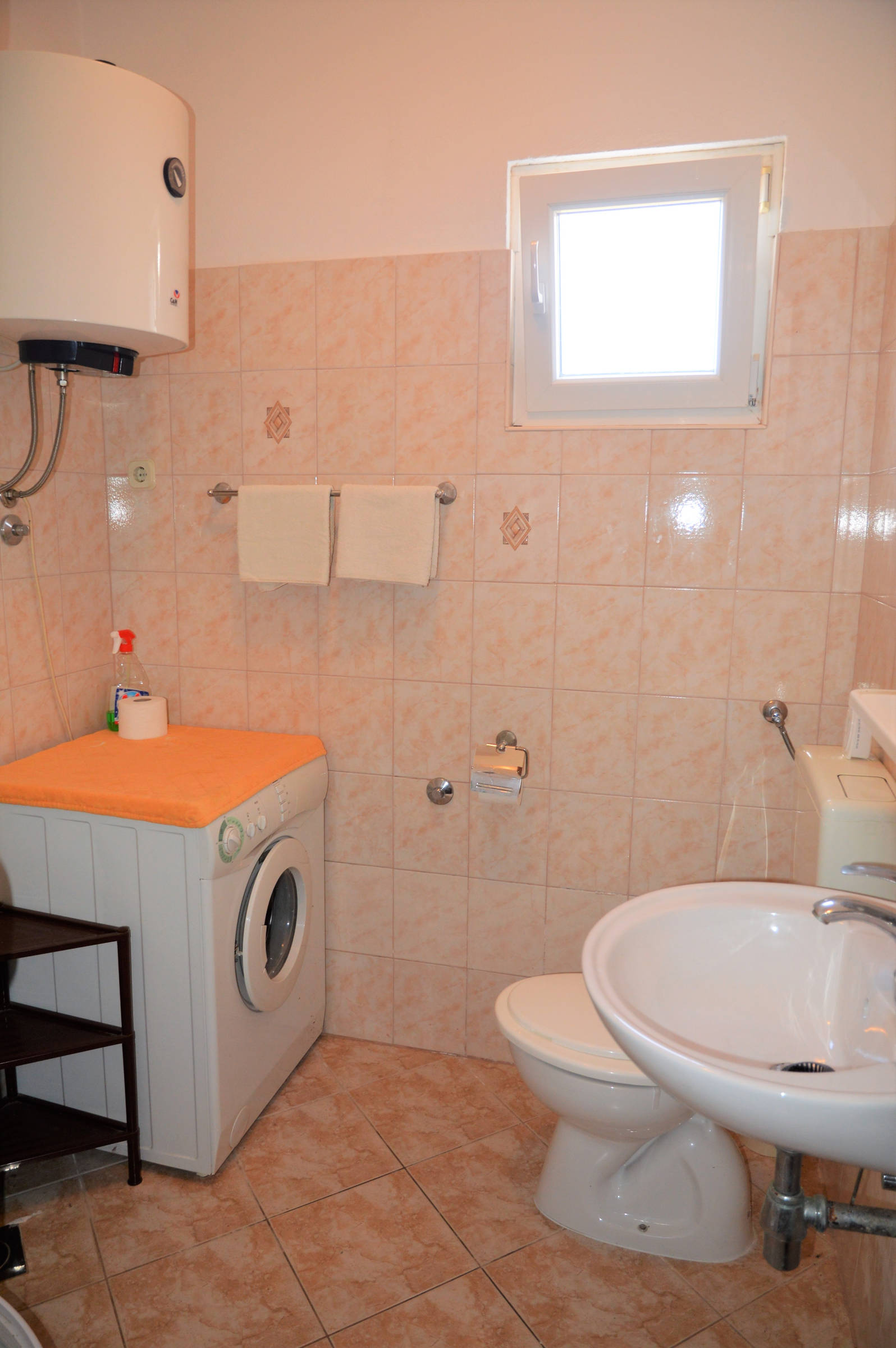 This 2 bedroom apartment is situated in place Poljica near Trogir in the first row from nice pebble beach with shallow sea . It has capacity 4 + 1 persons . There is only this apartment so other guests won’t bother you . It consists of kitchen with living room and dining room , 1 full bathroom (shower, hair dryer, washing machine), 2 bedrooms with double beds and spacious decked terrace.