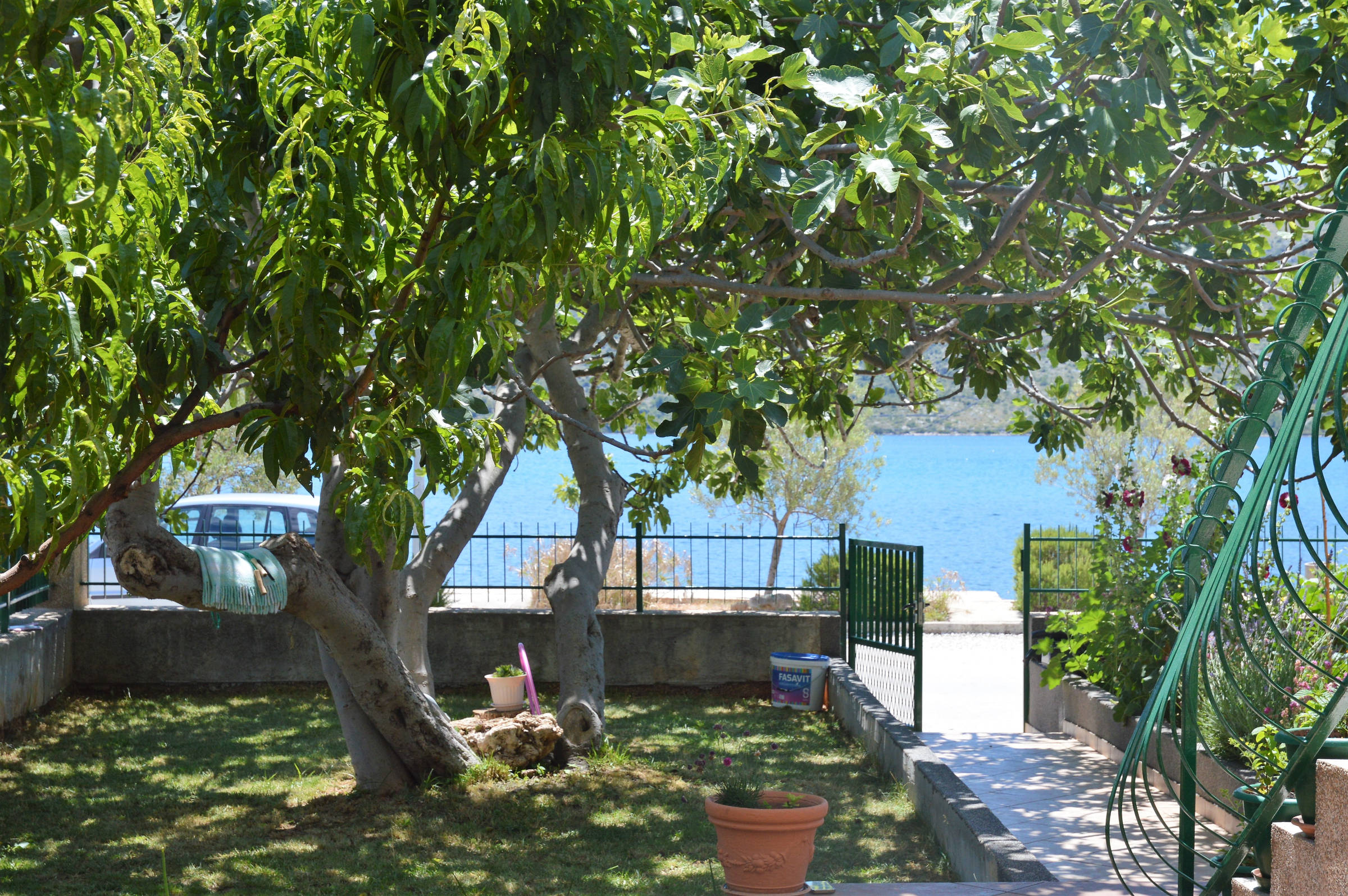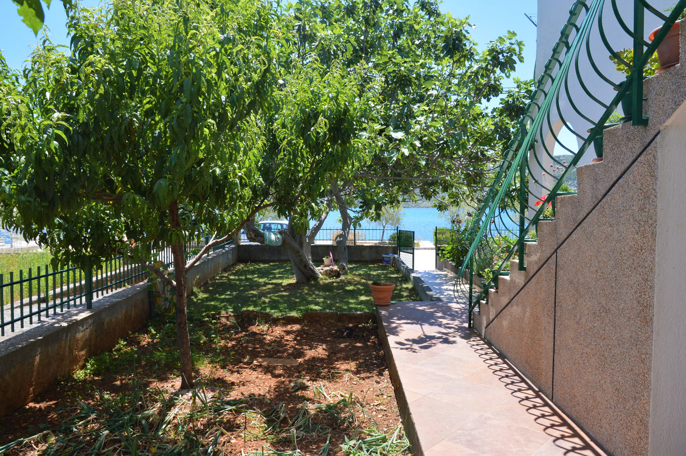 This 4 bedroom apartment is located in small place Poljica only 9 km from UNESCO-es town of Trogir. Apartment is situated in first row on sea, 40 m from nice pebble beach. This is the only unit in house so other guests won’t bother you. If you’re coming with a group of friends or you have a big family this is an ideal choice for you. You’ll have a whole house floor on your disposal with 4 air conditioned bedrooms and 4 balconies with sea view, yard with garden & grill, parking for 2 cars. Place is small with essential services and children’s playgrounds but still near all sights.