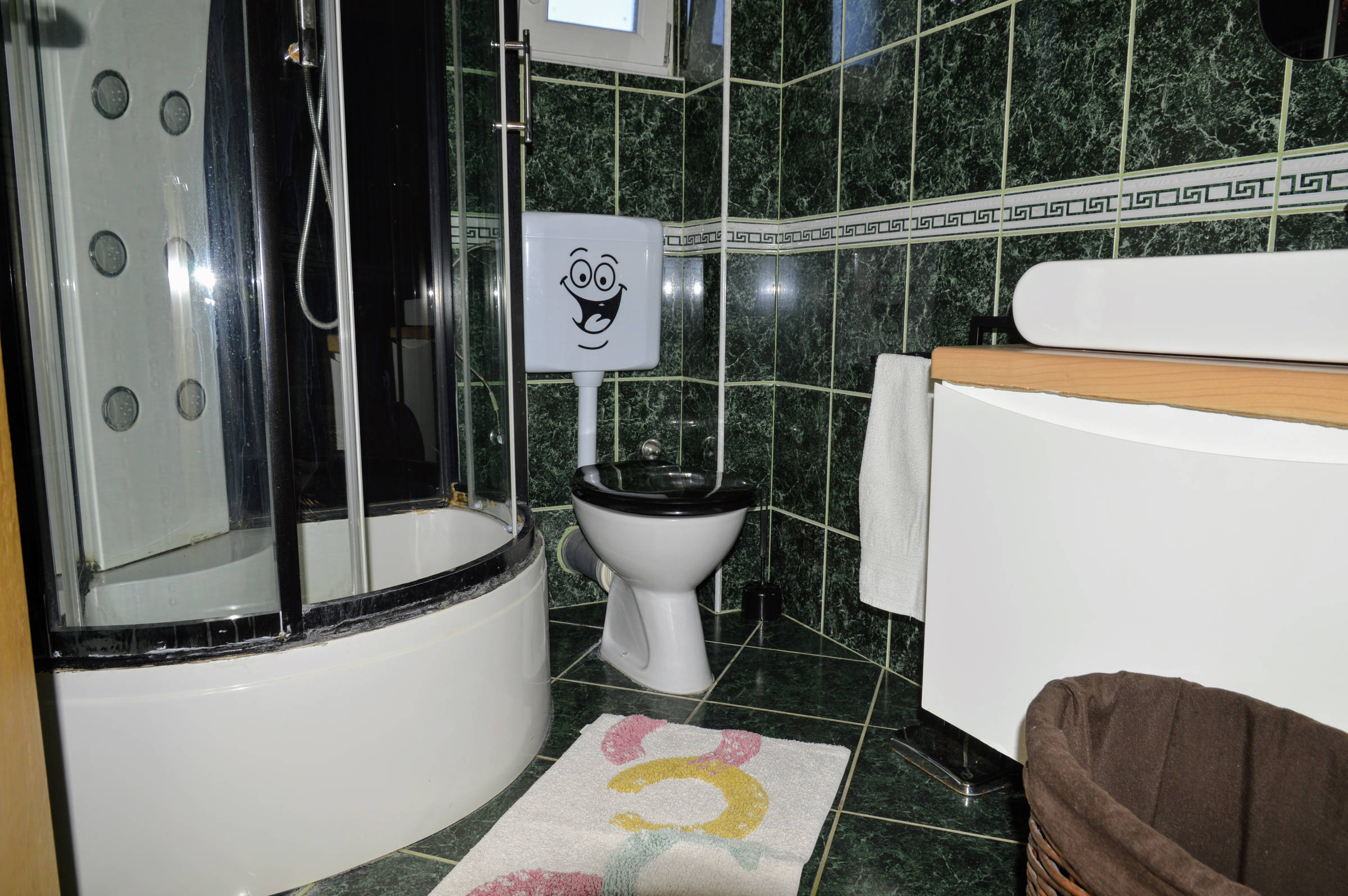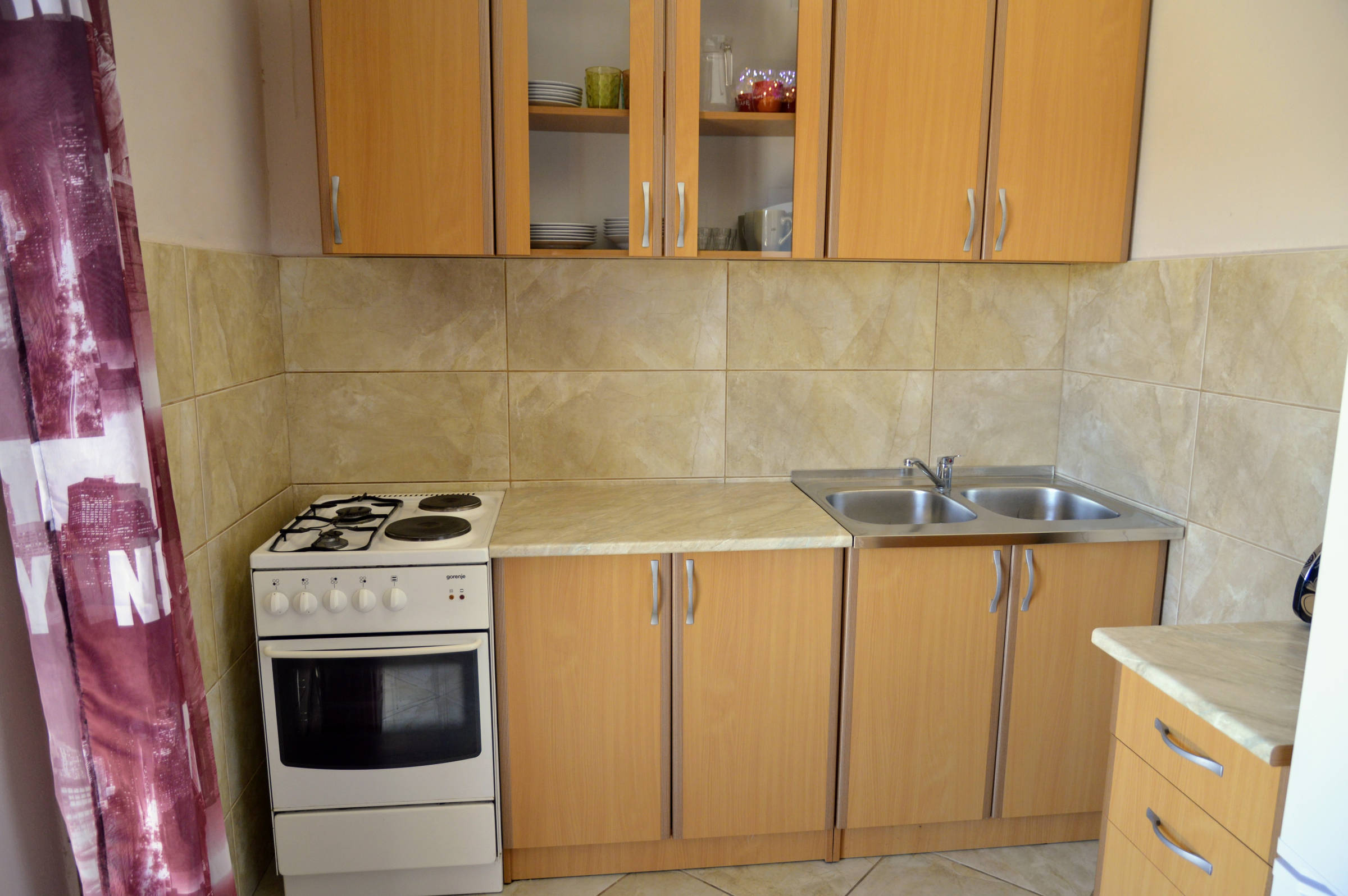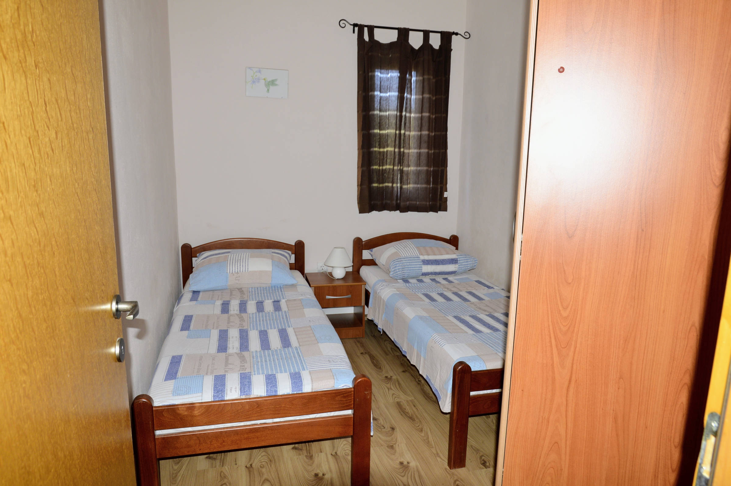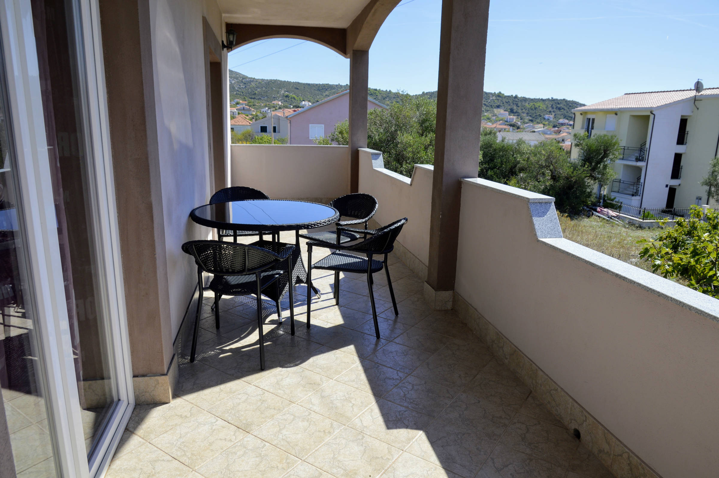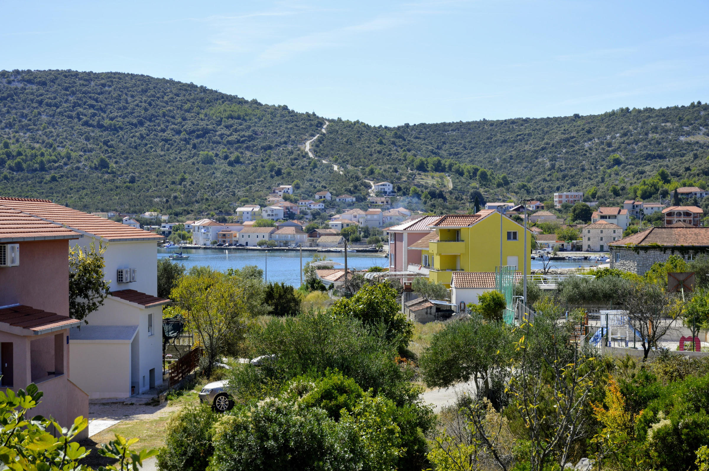 The house is situated in beautiful bay of Vinišće, 10 km from the Marina and 20 km from Trogir. It’s only 150 m from the pebble beach. In quiet street in vicinity of all services. Maximum capacity of the 3 apartment units is 12+2 persons. There is 3 bedroom apartment (4+2) on the ground floor , 2 bedroom apartment (3+2) on the first floor and 1 bedroom apartment (2+1) on the first floor . There is parking in front of the house and BBQ area behind the house. If you have a pet you can bring it with you( extra paid) . 3 bedrooms – double and twin beds, bathroom+wc, kitchen with dinning room (sofa bed for 1 child eventually) with exit to the balcony with a view to sreet and garden .